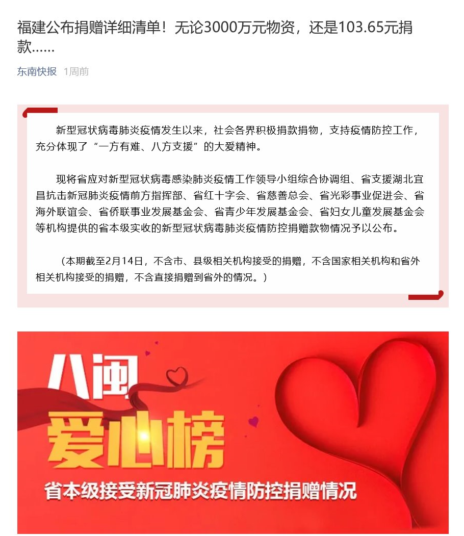 东南快报微信公众号报道:福建公布捐赠详细清单!无论3000万元物资,还是103.65元捐款