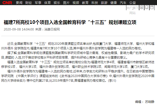 央广网报道:福建7所高校10个项目入选全国教育科学“十三五”规划课题立项