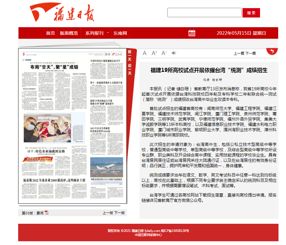 福建日报报导:福建19所高校试点开展依据台湾“统测”成绩招生