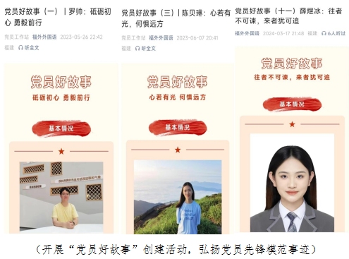 党支部建立每月理论学习及实践教育制度,不断创新学习形式、注重教育作用。积极响应号召,弘扬和践行习近平总书记提出的志愿服务精神,组织师生党员参加中国(福建)--东盟青年论坛、2023年对外文化交流活动周、第八届海上丝绸之路(福州)国际旅游节、2023年“一带一路商协会大会”、第二届中国茶叶交易会等活动,有序流畅完成了论坛发言主持、嘉宾接待、引导解说、会务服务、翻译口译等工作,运用所学的外语专业知识与志愿服务实践相结合,展现福外青年责任担当,发挥党员先锋模范作用。语桥志愿服务事迹被环球网、福建日报、人民网福建频道等主流媒体聚焦报道,并荣获省外事办、市电视台等主办单位多封感谢信。