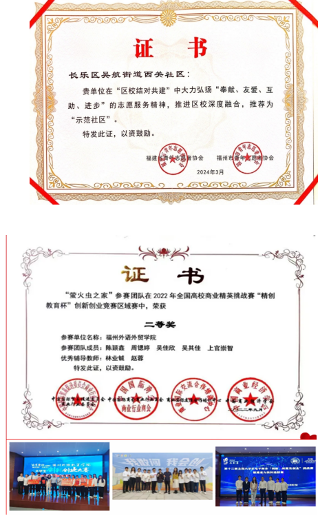 支部强化校地合作联动,联合吴航街道西关社区报送的“五治融合、五社联动—520(吾爱邻)近邻服务模式”成功入选全国社区治理十大优秀案例,助力西关社区获评 2023年福建省终身教育学习型社区、获评全国示范性老年友好型社区、获评2024年度福建省“区校结对共建示范社区”称号。助力吴航西关社区、营前街道湖里村上榜入选2023年度长乐区“最美志愿服务文明实践所(站)”先进典型名单。