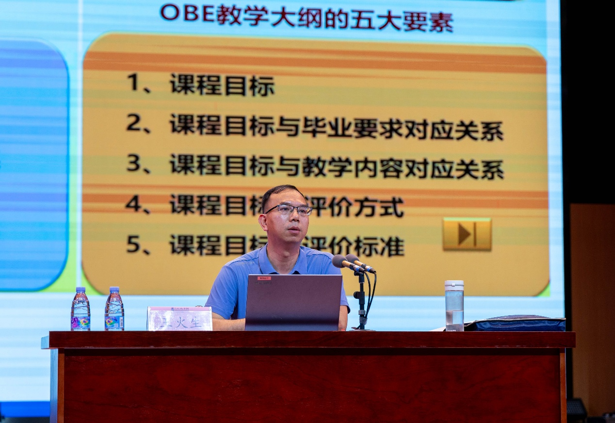 王火生在报告中详细解读了如何基于OBE教育教学理念制定本科人才培养方案、设计课程教学大纲、开展课程评价与持续改进、课程目标与毕业要求、教学内容的对应关系及如何相互支撑作了重点阐述。