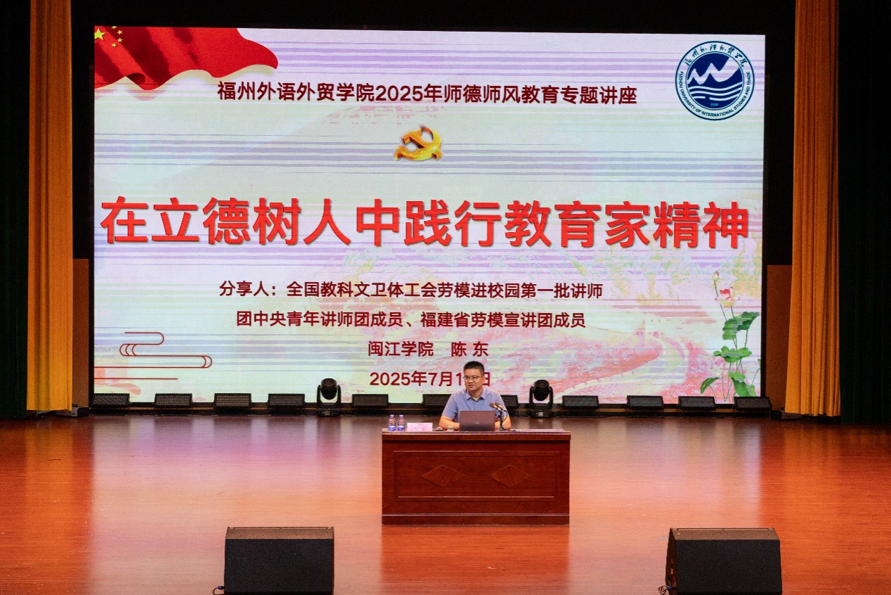 7月10日学校邀请闽江学院马克思主义学院院长、全国教科文卫体工会劳模进校园第一批讲师、团中央青年讲师团成员、福建省劳模宣讲团成员陈东来校开展师德师风专题讲座,1千余名教职工参加培训。