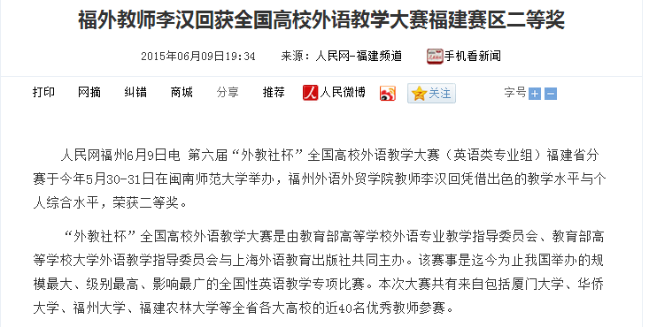 人民网报道我校教师获全国高校外语教学大赛福建赛...
